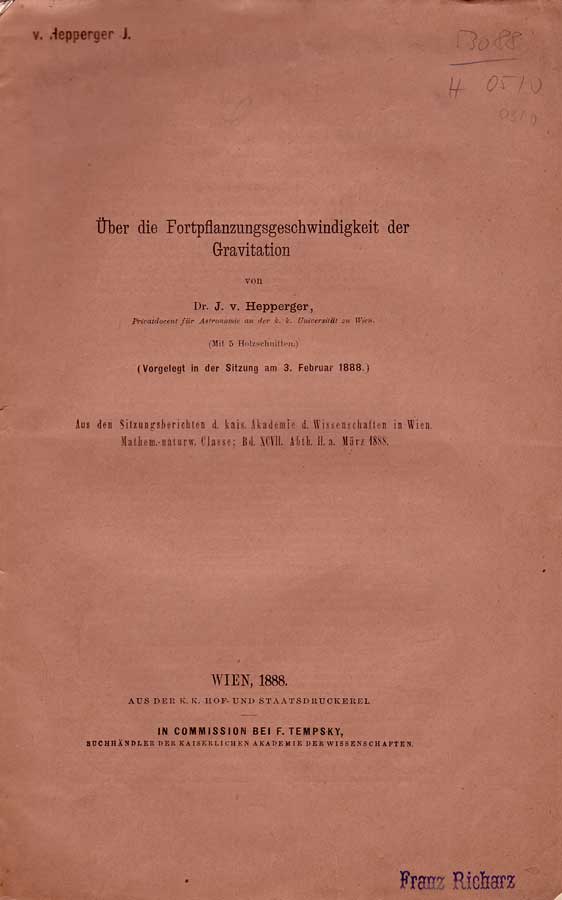 Hepperger zu Tirschtenberg und Hoffensthal, Josef von "Über die Fortpflanzungsgeschwindigkeit der Gravitation" Wien 1888. Wird in Kürze Online erscheinen. Hier eine Kurzbiographie des Autors.